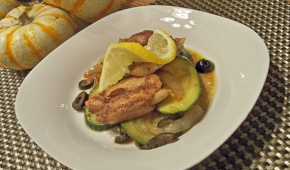 This tasty chicken dish is nicely paired with zucchini, onions and olives and garnished with sliced lemon.