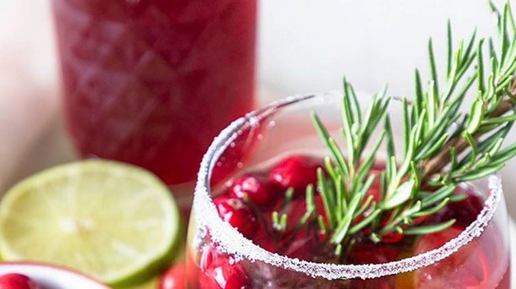 Pour into glass over ice and top with the frozen cranberries & sprig of rosemary ?