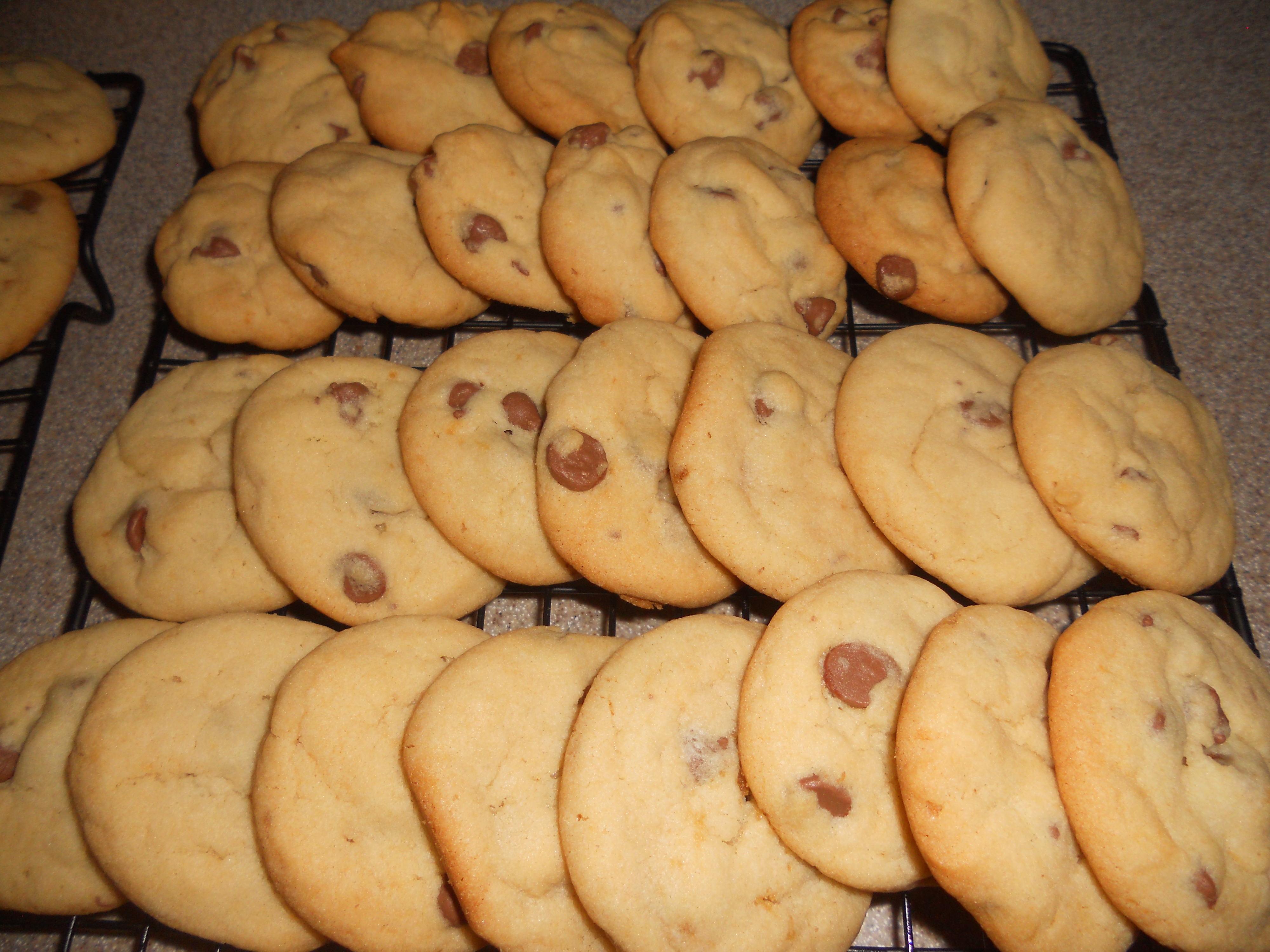 Cream butter and sugars. Add eggs, oil, vanilla; mix well. Stir in dry ingredients. Add chocolate chips. Drop by teaspoonfuls on cookie sheets. Bake 350 for approx 10-12 mins till just turning golden brown
