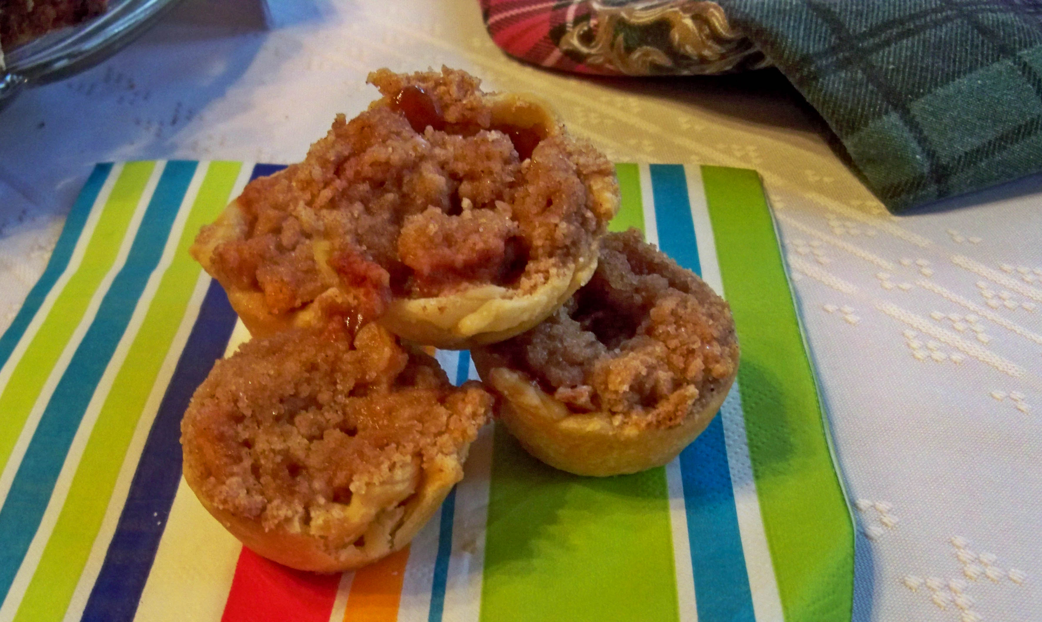 Divide the apple mixture between the 24 mini pies, filling each all the way to the top of the cup. Sprinkle each pie generously with the crumb topping. Bake the pies at 350 degrees for 15-20 minutes until the crumb topping and crust are brown and the apple filling is bubbly.
