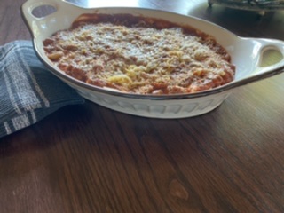 Baked pasta dish with penne or mostaccioli noodles, spaghetti meat sauce and cheese.