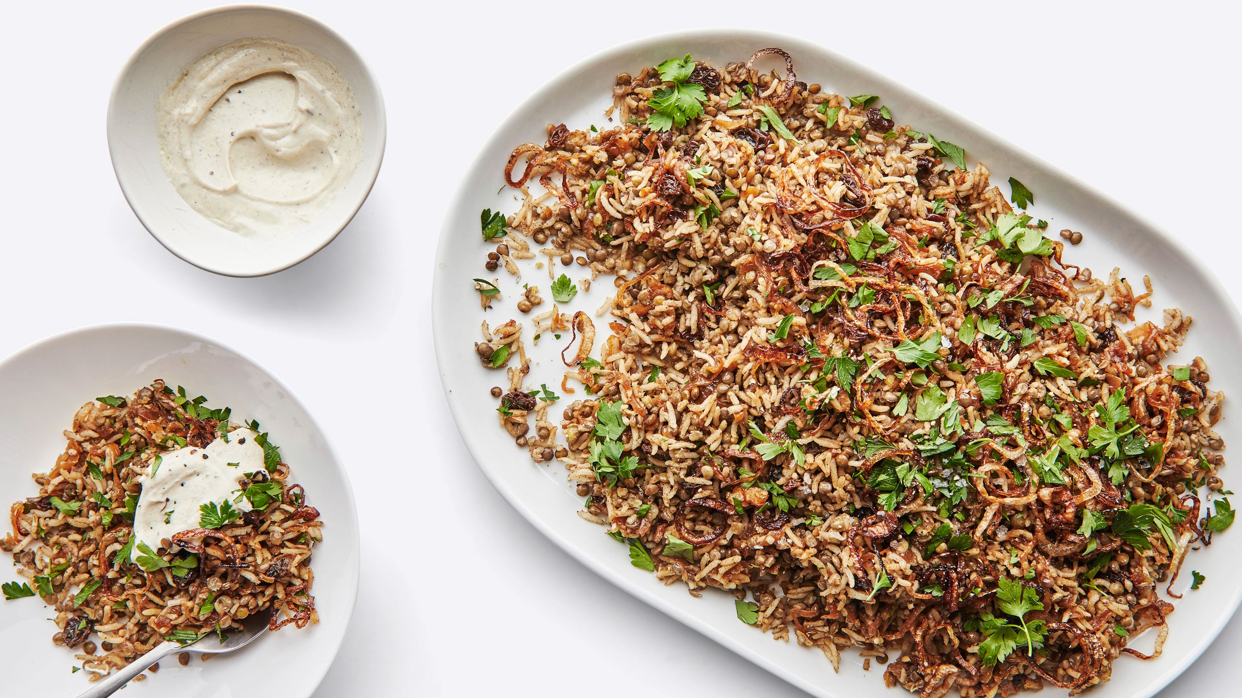 Transfer mujadara to a platter. Top with parsley and remaining fried shallots. Serve with yogurt sauce alongside.