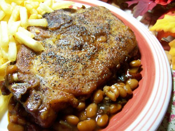 This is an easy but really tasty pork chop dish --- purchase the thicker size pork chops or you may use 2-3 larger pork steaks, the thinner chops tend to fall apart when baked as they bake too fast, if desired you can top with shredded cheddar cheese the last 15 minutes of baking, also chopped fresh garlic may be added also to the bean mixture -- this may also be cooked in a crockpot, just brown the chops first in a skillet.