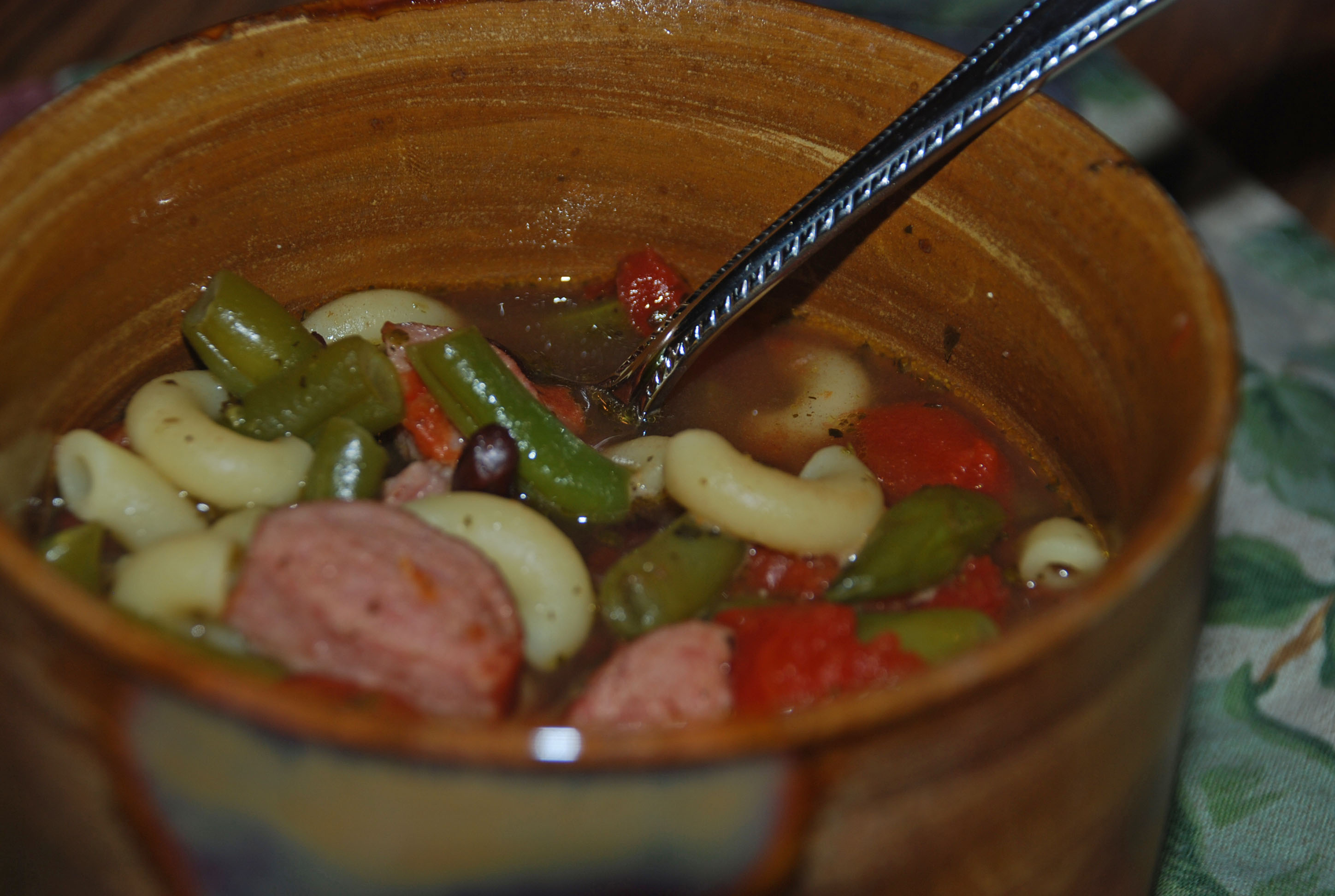 A filling Italian soup with sausage, pasta, and vegetables.