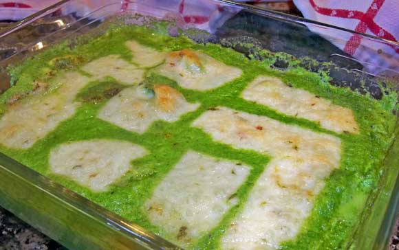 A baked dish with seasoned chicken and a poblano cream sauce.
