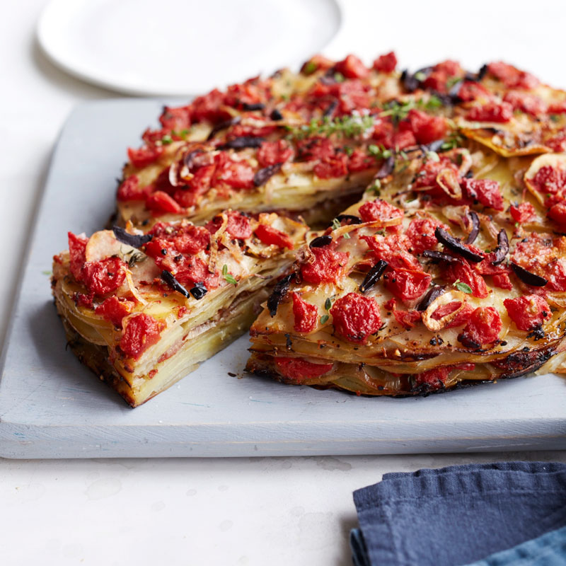 Fancy, easy, hearty family dinner with layers of thinly sliced potatoes.