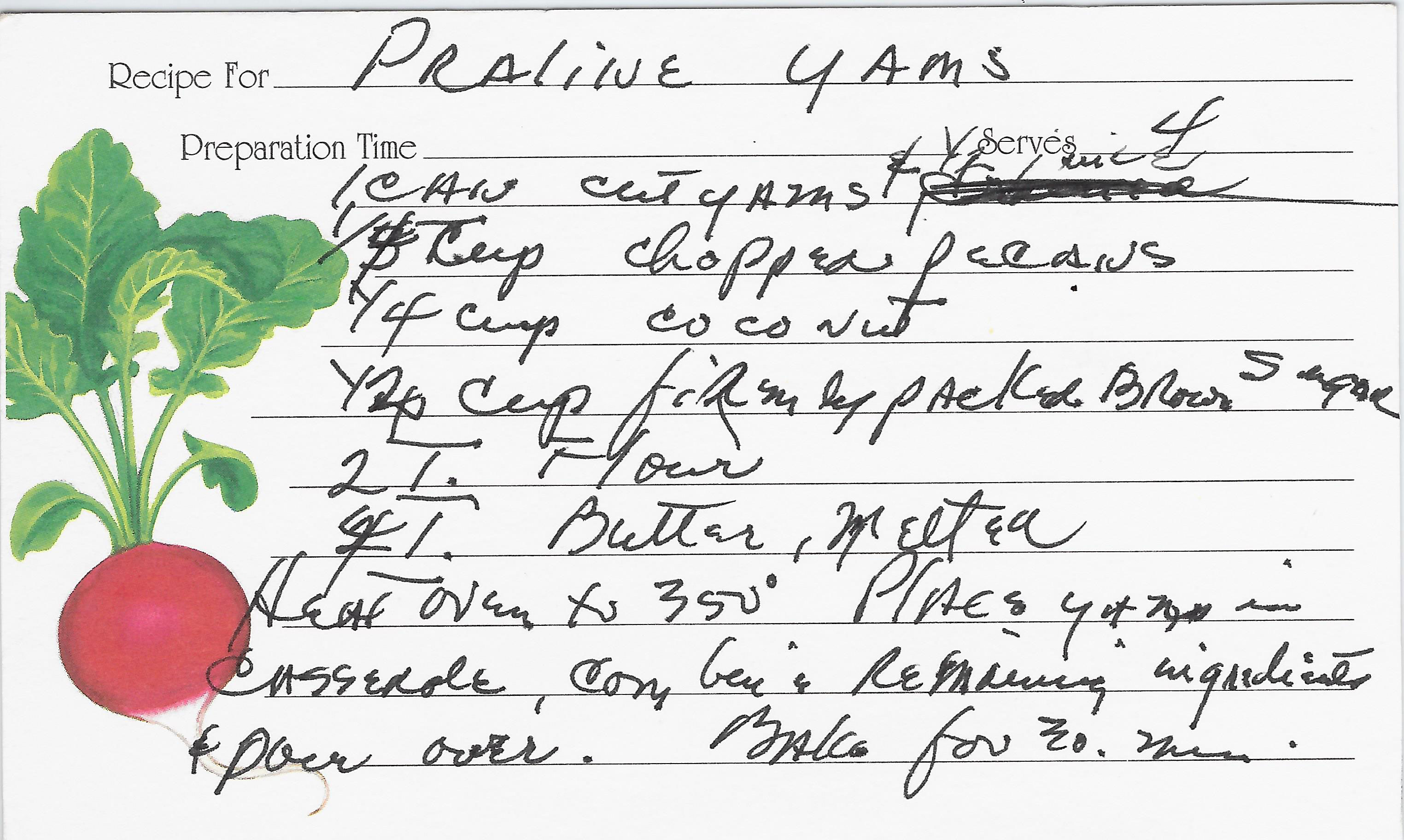 Yams with pecans, coconut, brown sugar, and butter, baked in a casserole.