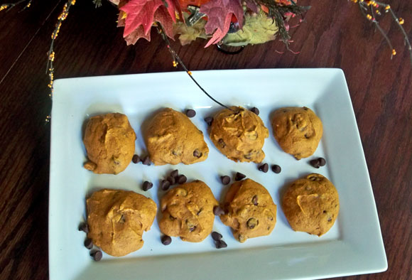 Moist, puffy pumpkin cookies seasoned with cinnamon and nutmeg; the chocolate chips add a perfect sweet twist.