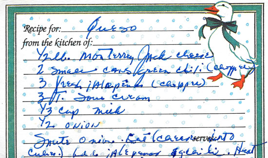 Add jalapeno and green chilies. Heat slowly and add milk. Add cheese and melt.
