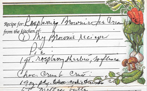 Raspberry sherbet and brownie crumbles served up in a chocolate crust and topped with chocolate sauce.
