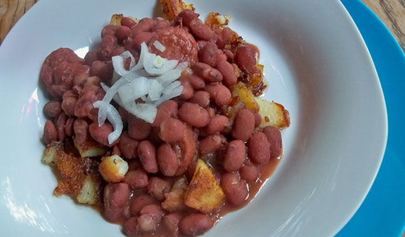 A simple red beans recipe; add sausage or ham if you like. Also great served over fried potatoes or brown rice.