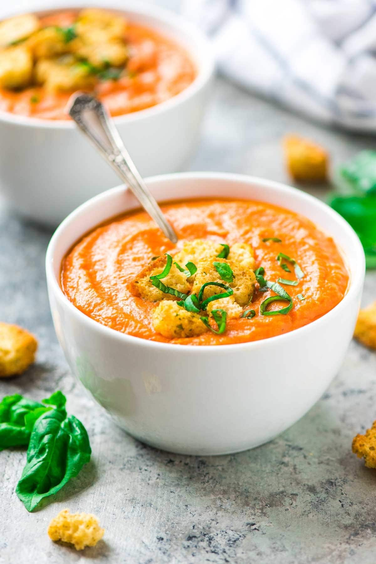 Roasted Carrot Tomato Soup. An easy roasted carrot soup with garlic, cumin, and Greek yogurt to make it creamy and filling. Simple, healthy, and delicious!