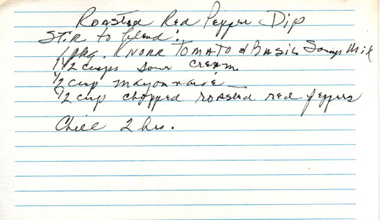 Sour cream dip seasoned with Tomato Basil soup mix and roasted red peppers.
