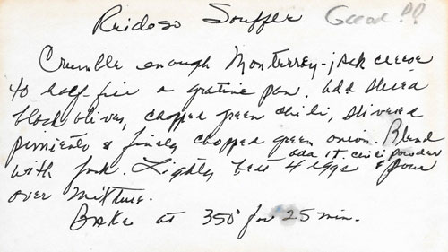 Quick and easy breakfast souffle with black olives, green chilies, pimiento, green onions, and cheese.