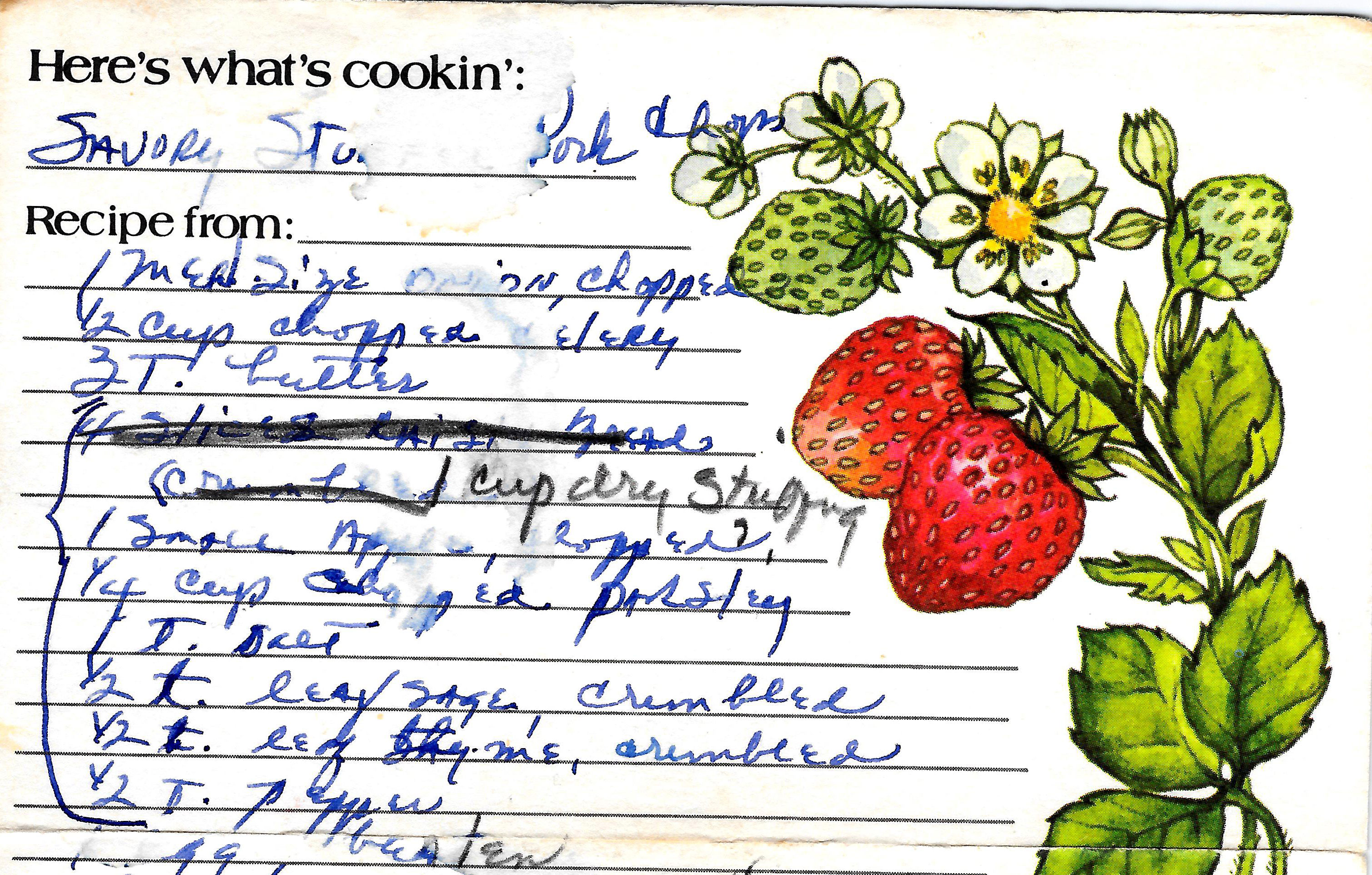 Stuffing filled pork chops, browned and simmered with onion, celery, apple, and seasonings, served with light gravy.
