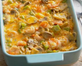 Add the bouquet garni and the stock in which the shrimp had been barely cooked along with salt and pepper and simmer gently for 5 minutes. Push the lightly cooked vegetables and bouquet garni to the sides of the pan and add the rice to the liquid in the center. Cook 5 minutes with cover on.