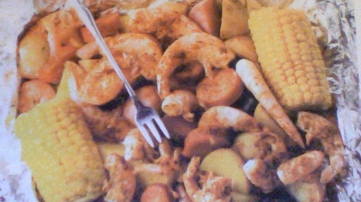 Add potatoes, sausage, corn, and shrimp evenly to the center of each foil.