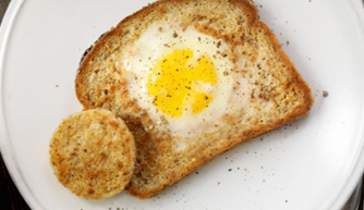 Cut a hole out of the center of the piece of bread with a medium size glass.
