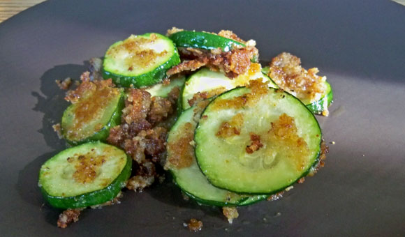 Sliced zucchini is lightly breaded and then fried in a skillet; similar flavor to deep-fried zucchini without the heavy grease and breading.