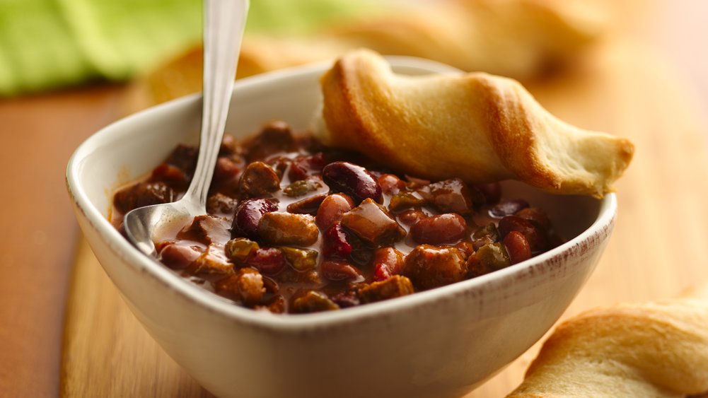 Slow-cooked chili simmers deliciously with bites of budget-friendly round steak cooking to tender perfection. Pop a package of Pillsbury refrigerated breadsticks in the oven at the end of the chili cooking time.