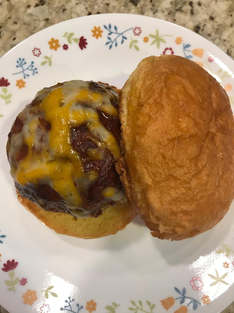 Bacon & Cheese Stuffed Meatball Burgers smoked slowly brushed with BBQ Sauce and seved on a grilled Brioche bun.