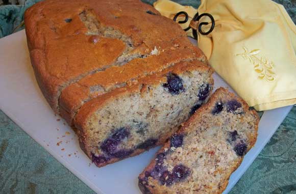 Sift together flour, baking soda, salt, and cinnamon. Cream butter and sugar until light. Add eggs, banana, and sour cream until blended. Gradually add dry ingredients. Fold in blueberries and pecans. Bake at 350 for 1 hour or until golden. Makes one 9 inch loaf.
