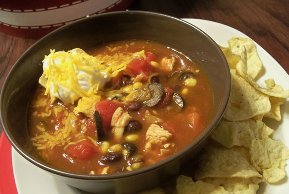 It's easy to substitute diced chicken tenderloin pieces for the ground chicken if you prefer (but season diced chicken pieces with chili powder, cumin, & sage while browning them before adding other ingredients, for best flavor). I also often substitute a can of Mexi-corn in place of the corn and all diced bell peppers. Sometimes it's easier to use a small can of green chiles in place of the jalapeno as well. Make this soup ahead in the day and keep it warm in crockpot for dinner later.