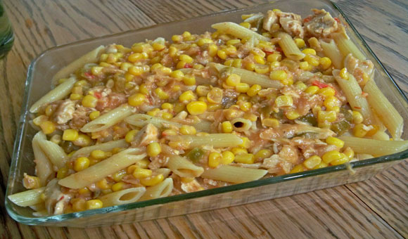 pasta, chicken, corn
