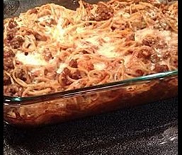 Spaghetti baked with ground beef, tomatoes, celery and cheese.
