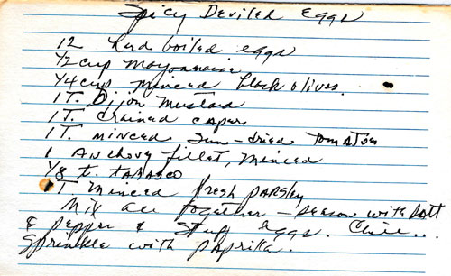 Hard-boiled eggs with sun-dried tomatoes, minced anchovy, tabasco, capers, and black olives.