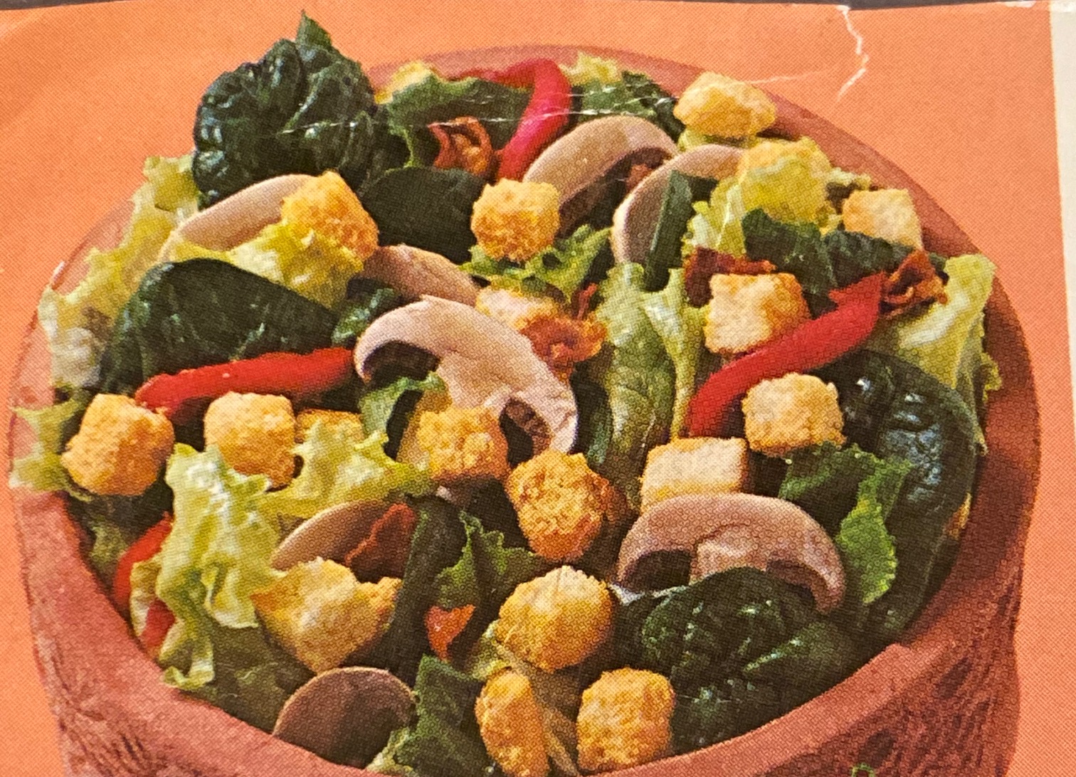 Mix together spinach leaves and lettuce leaves that have been torn into generous bite-size pieces. Add all other ingredients except croutons. Toss well.