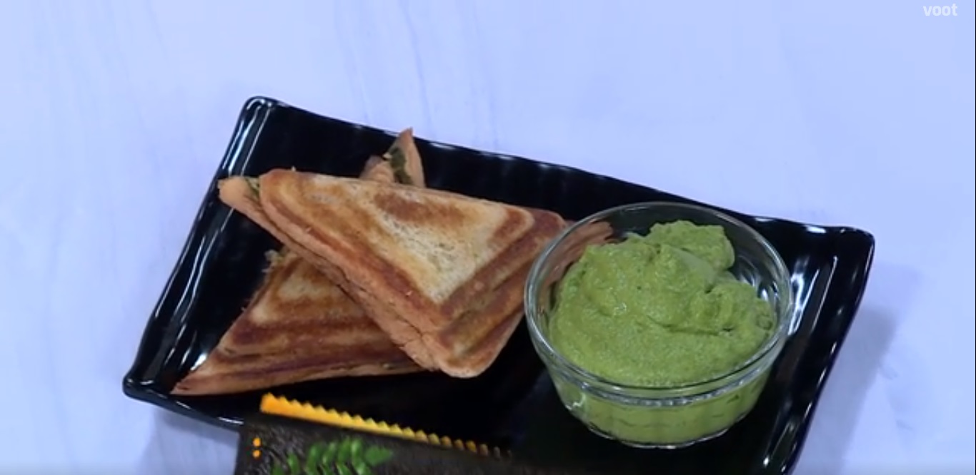 On a bread, add chutney, onion, cucumber, potato, masala. Add butter on the other slice.