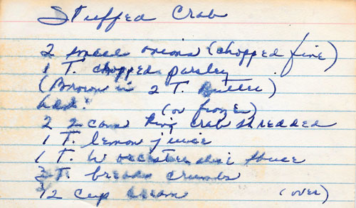Brown onion and parsley in butter. Add crab, lemon juice, Worcestershire, bread crumbs, cream, minced egg, and tabasco, salt and pepper.
