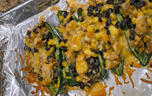 Poblano peppers stuffed with chicken, corn and beans or your favorite veggies.
