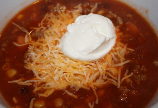 A quick mix of ground beef, corn, beans, and taco seasonings for a delicious soup.