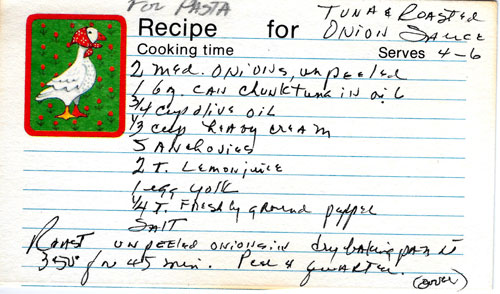 Roasted onions pureed with tuna and seasonings, then served over pasta.