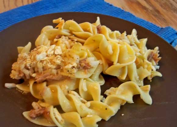 A simple mix of tuna and noodles topped with crumbled crackers.