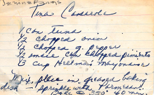 Baked casserole with tuna, onion and green pepper with pimiento.