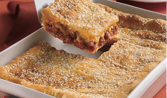 Unroll 1 can of the dough; place in ungreased 13x9-inch (3-quart) glass baking dish. Press in bottom and 1/2 inch up sides of dish. Spread beef mixture over dough; sprinkle with cheese. Unroll second can of dough; place over cheese. Sprinkle with sesame seed.