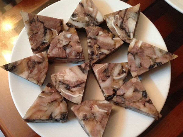 Vietnamese head cheese is made of parts of pig head such as ears, nose and tongue, combined with some spices