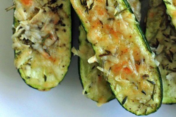 Pre-heat oven to 350F, lightly brush both sizes of the zucchini with olive oil and place on a foil-lined baking sheet. Mix cheese and herbs together in a small bowl and sprinkle over the zucchini along with salt and pepper to taste. Bake for 15 minutes and place under the broiler for the last 3-5 minutes until cheese is crispy and browned.